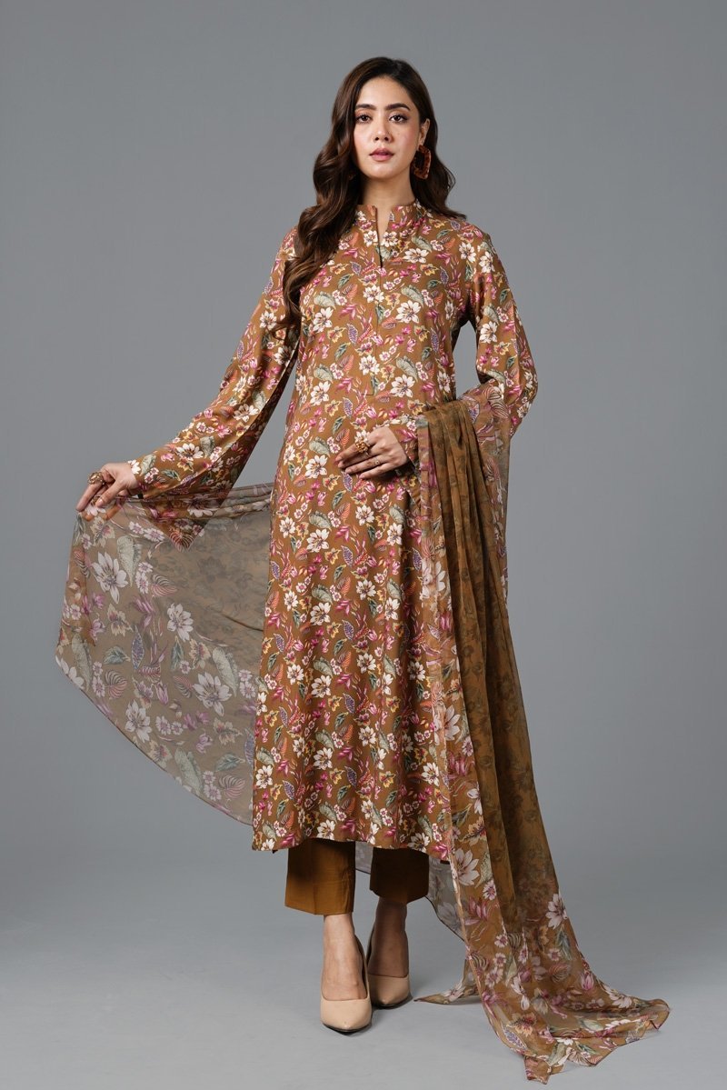 Bareeze 3 Piece Printed Chiffon Suit (PR1517-Brown)