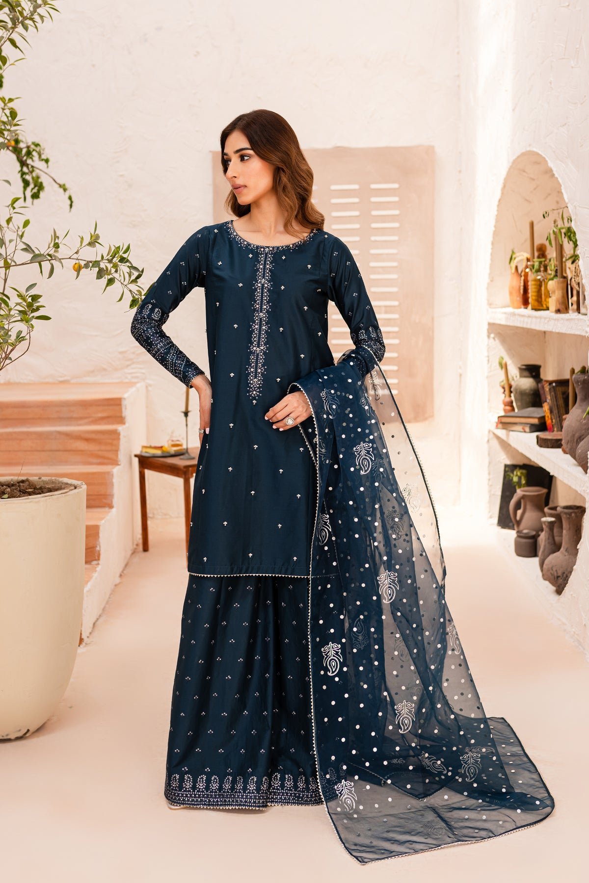 Paired with embroidered Egyptian cotton sharara.
