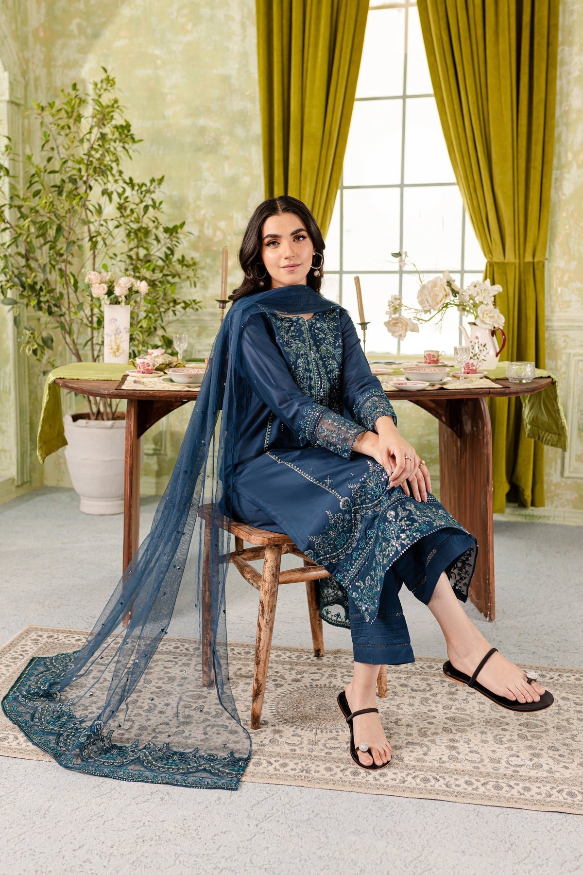 Experience an unparalleled comfort with finely woven Pima lawn in the shades of Aegean blue. Outfit features a fully embroidered paneled shirt finished with embroidery spread at center panel and embellishments at neckline. Noteworthy details include organza embroidered borders at shirt hem and sleeves. To beautify the design, sequins and laces are added.