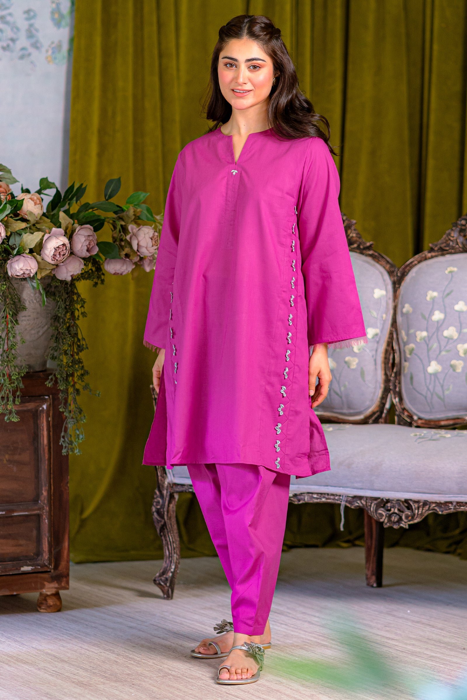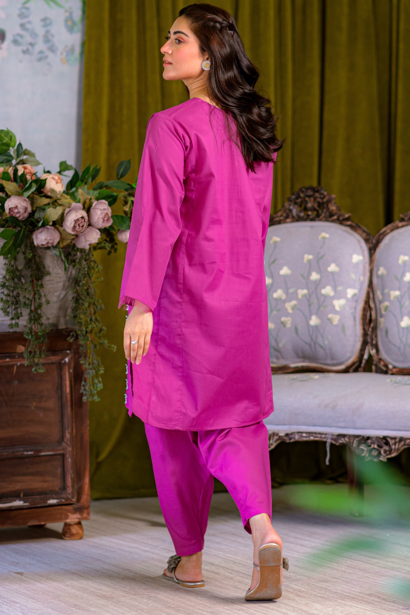 Magenta colored box cut solid kurta paired with shalwar