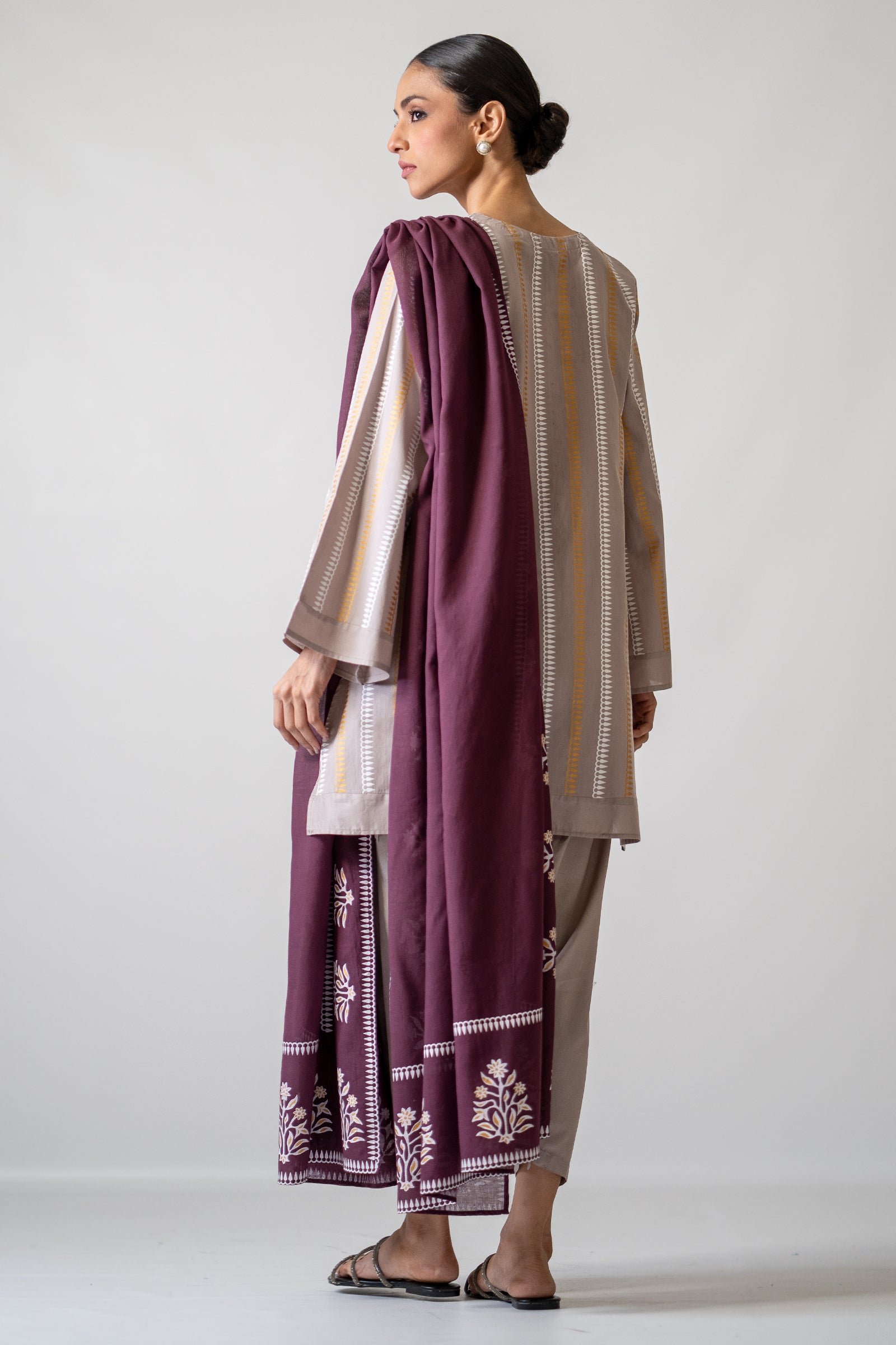 This light grey colored kurta paired with sleek shalwar , dupatta with hand screen print is a must buy this season