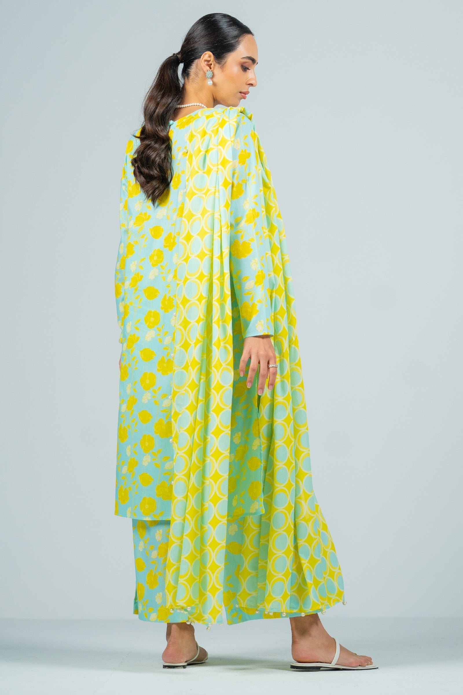 Slay in this aqua blue colored digital print three-piece Stitched