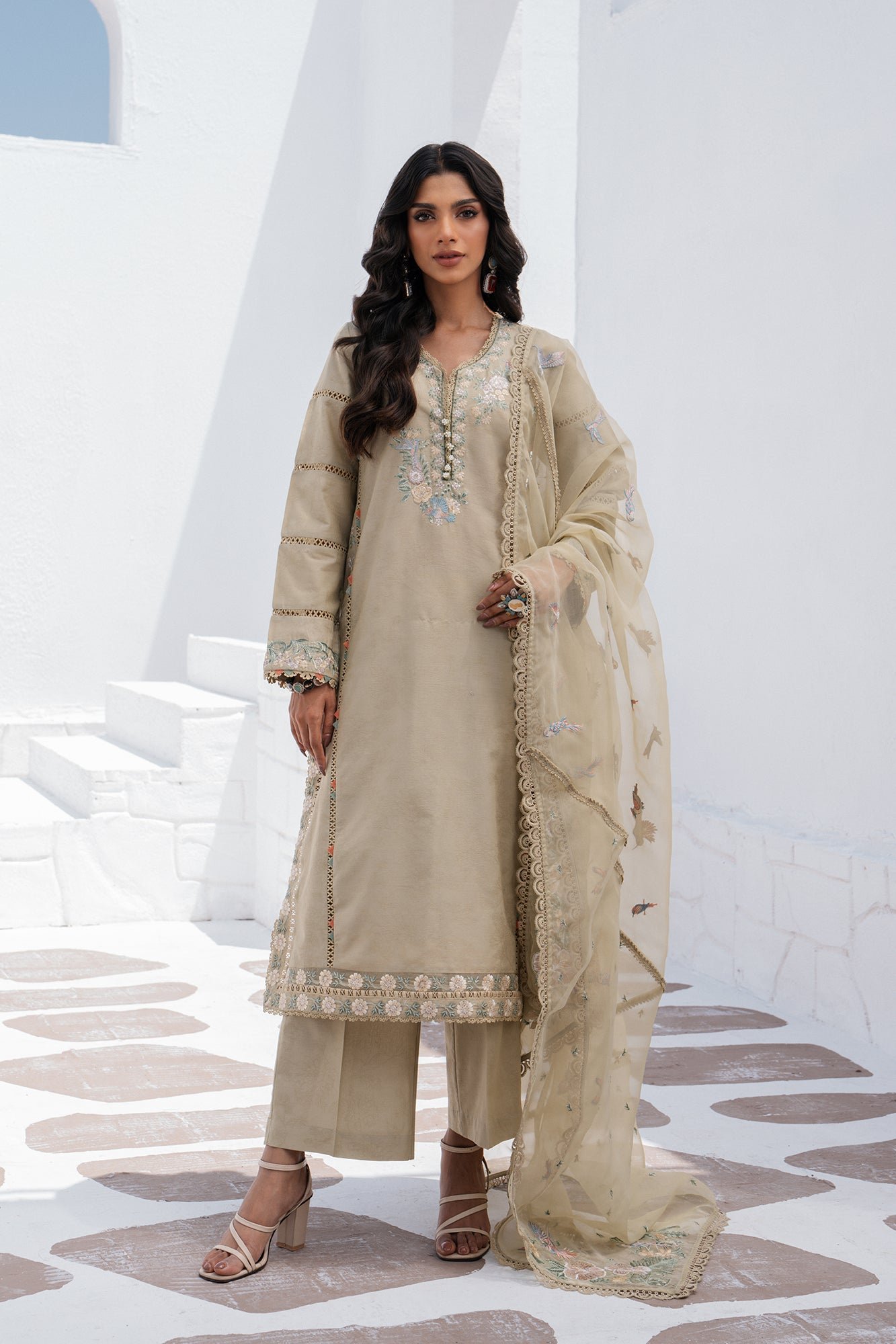 A classically rich composition is portrayed on this classy ensemble rendered in a subtle mid olive shade. It depicts a contemporary shirt enriched with aesthetically appealing floral embroidery in vibrant hues and enhanced with delicate lace. Paired with a trendy culotte trouser and a gracefully draped embroidered dupatta, this exquisite outfit is a must have to style at formal events this season.