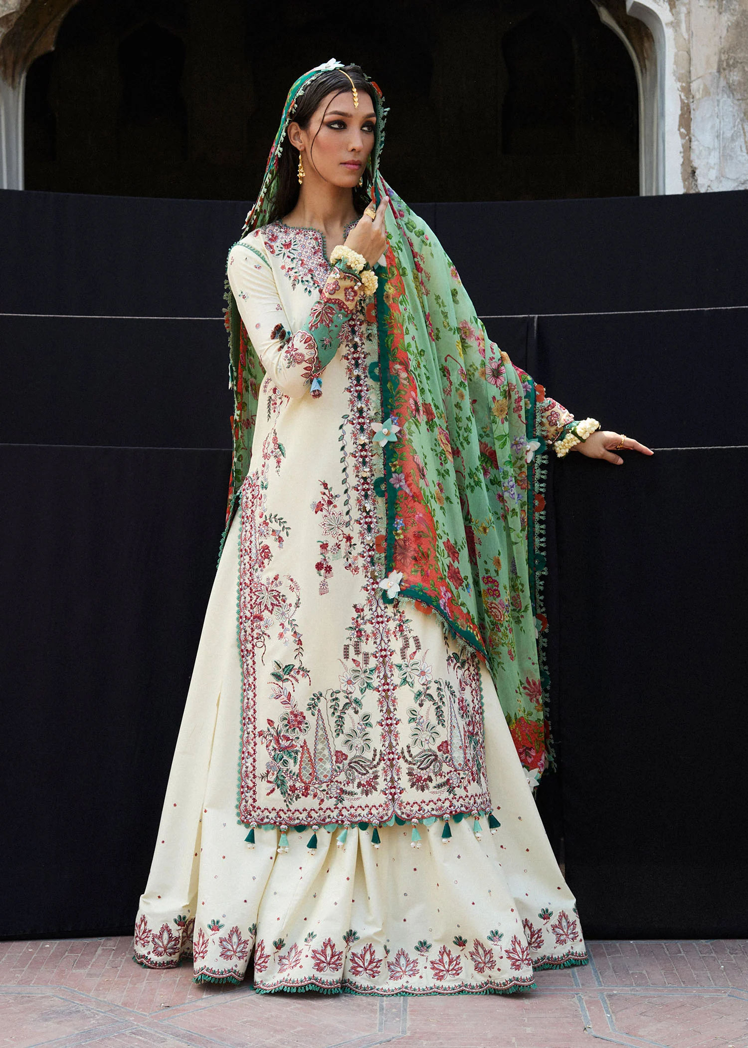 A butter-yellow ensemble crafts a picturesque view that harmonizes tradition and modernity, showcasing skillfully executed embroidery on the finest lawn fabric with detailed embroidery stitches. Alluring modern elements are combined with intricate embroidery in hues of ivory, maroon, orange, mint, green, and ice blue, creating an ethereal aesthetic. The shirt features a variety of embroidery techniques. A printed dupatta, paired with same color cotton embroidered trousers, completes this dazzling and contemporary silhouette.