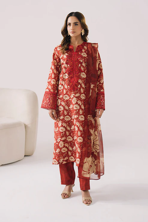This design showcases a printed lawn shirt with intricate embroidered detailing for an elegant finish. The printed chiffon dupatta enhances its airy appeal, paired with a printed lawn trouser for breathable comfort.