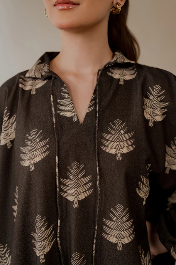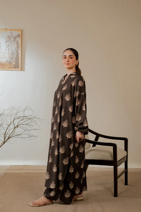 Charcoal grey printed loose-fit kurta paired with matching culottes.