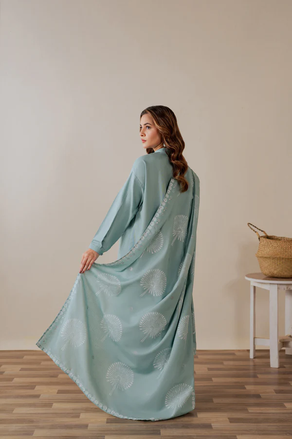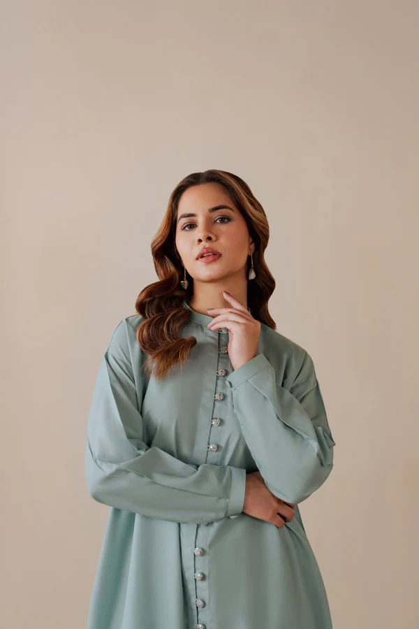 Pastel turquoise karandi shirt paired with a loose fit trouser.