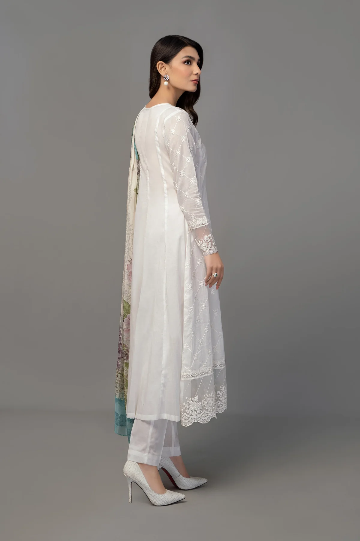 Frock with embroidered panels embroidered sleeves along with printed dupatta and straight trouser