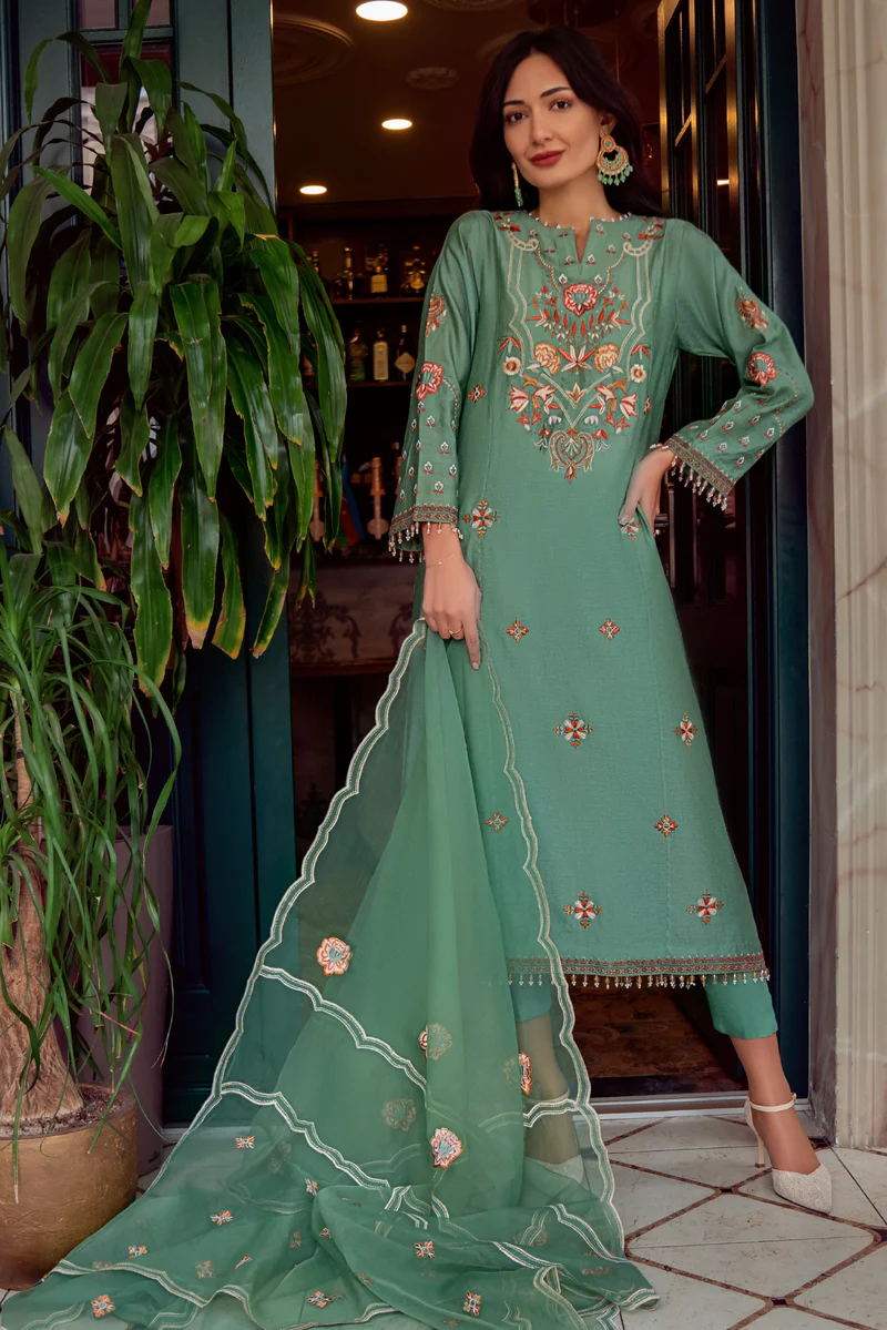 Muntaha 3Pc Embroidered Cotton Suit Teal Green- Emre