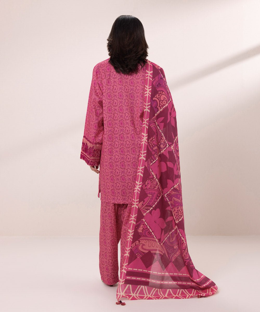 Elevate your festive style with our pink, three-piece embroidered suit accented with a voile dupatta.