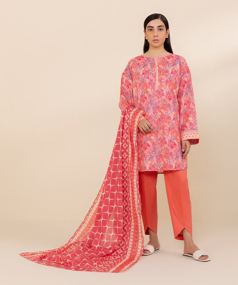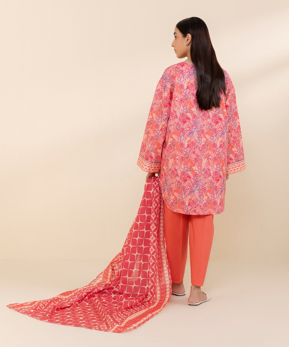 Bloom into the season with our coral rotary printed three-piece featuring a lawn shirt, cambric trouser, and voile dupatta.