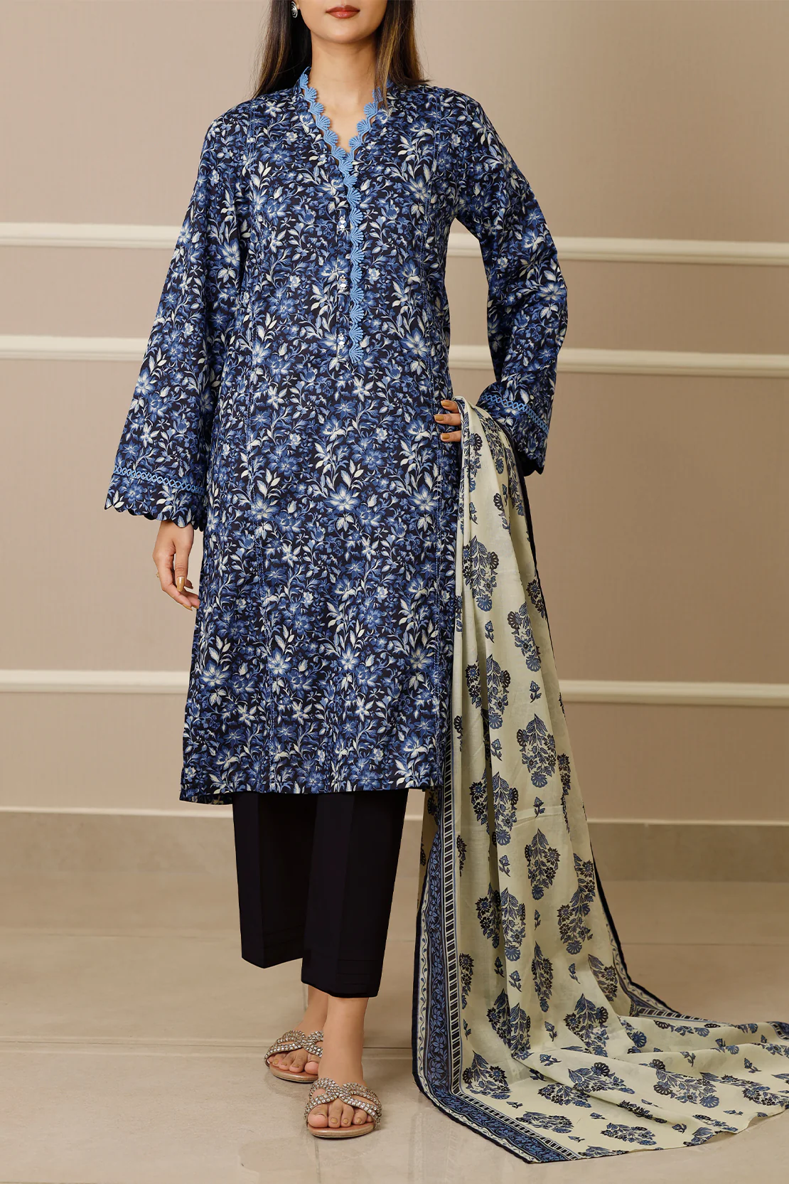Introducing Saya’s Unstitched Printed Lawn 3-Piece Suit in a vibrant blue hue. This ensemble features a premium printed lawn shirt, a matching printed lawn dupatta, and dyed cambric trousers, all unstitched to allow for personalized tailoring. The breathable and lightweight lawn fabric ensures comfort, making it ideal for casual outings and semi-formal occasions.