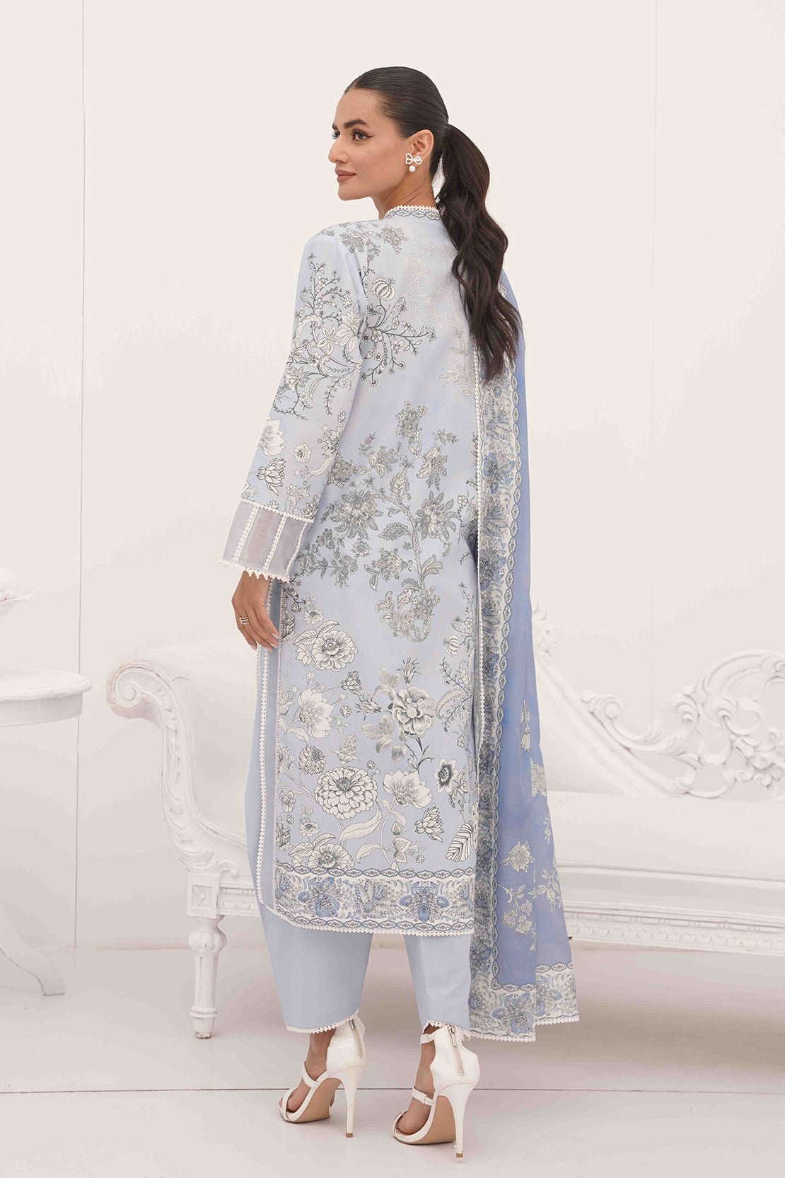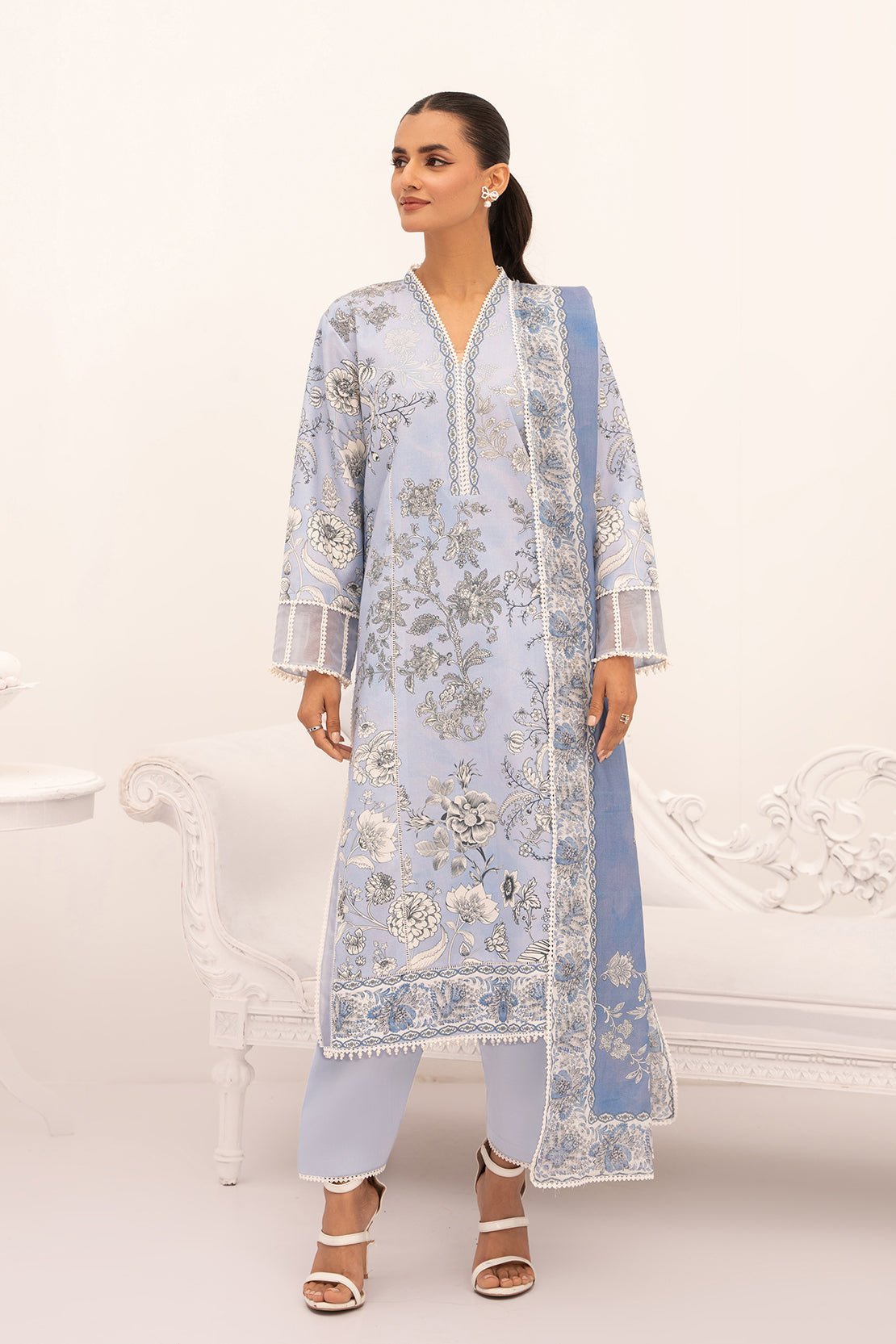Serene as the sky meeting the ocean, this blue and white 3 piece ensemble captures the essence of tranquility and simplicity.
